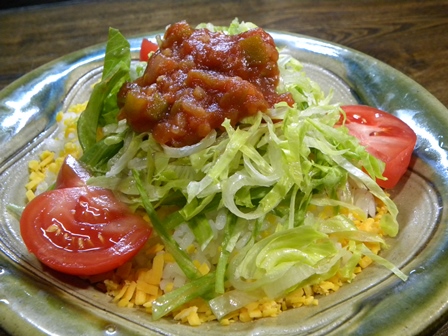 ご飯の上にタコスの具をのせたボリューム満点のタコライスです!レタスたっぷりで美味しさUP